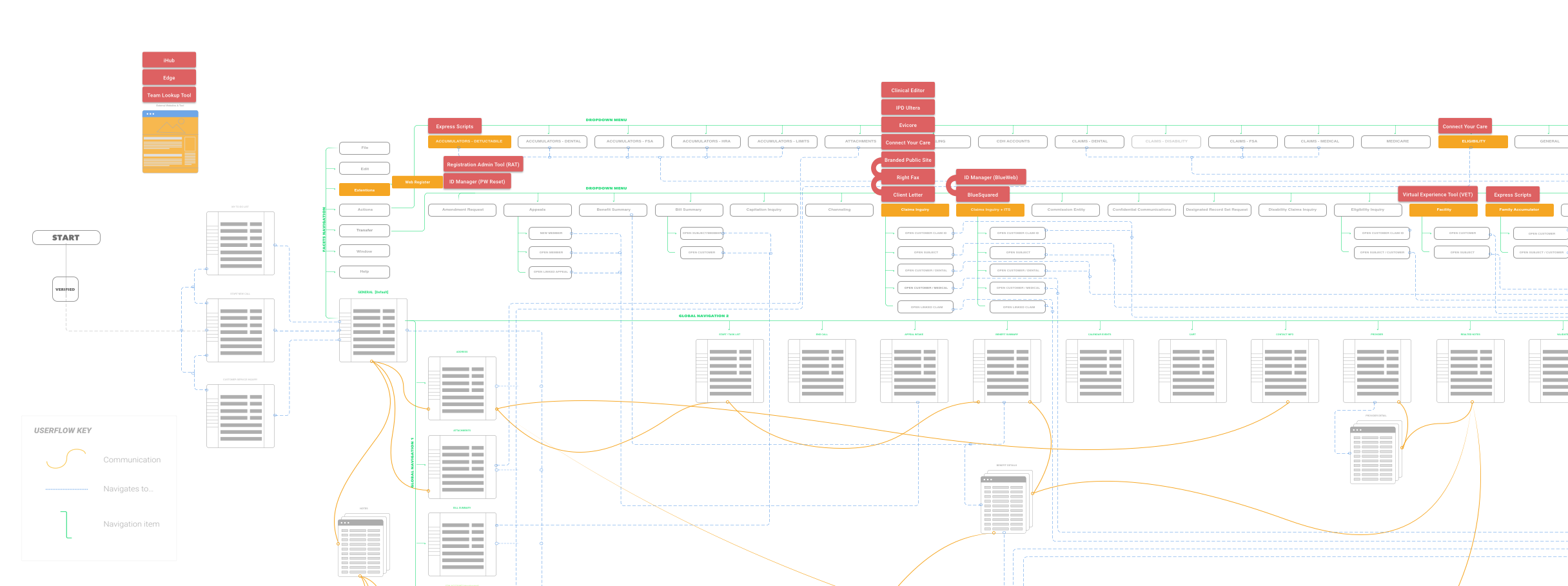 Throughout the design lifecycle, we periodically circled back to information architecture diagrams of both Facets and Advocate Desktop. These helped us visualize the screens that CSRs would need to access to accomplish tasks associated with features, and helped us understand where and how we were making improvements over the old interface.